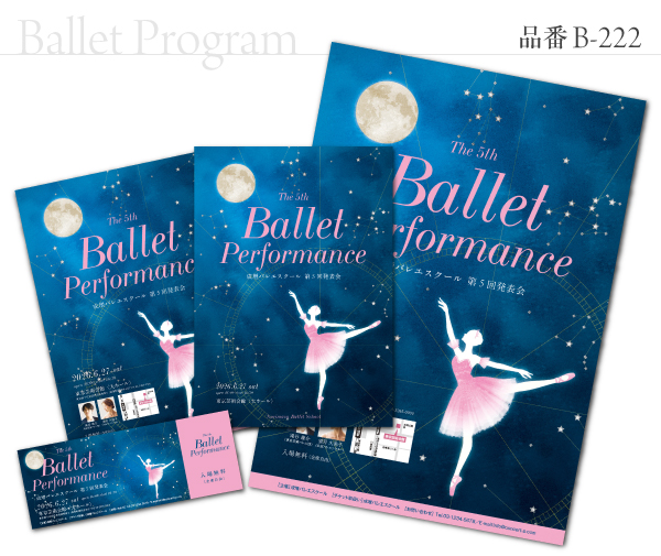 深い夜空を背景に、星々と月の光の中で踊るバレリーナを描いたデザインです。