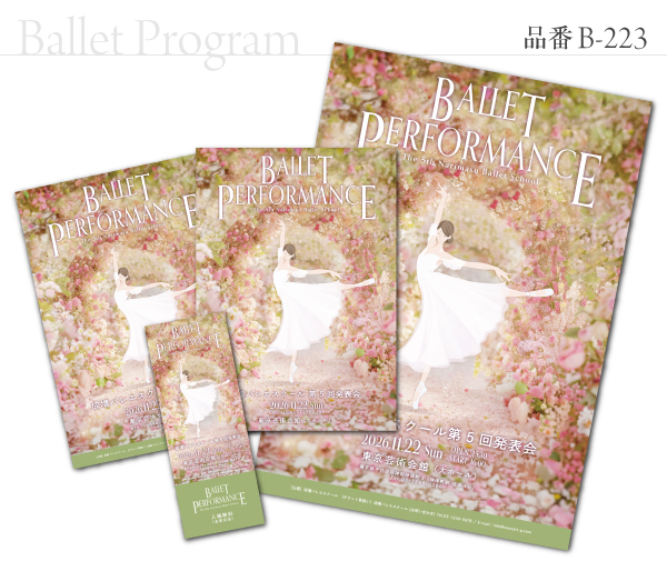 柔らかな光に包まれた花のトンネルに、白いロマンチック・チュチュのバレリーナを描いたデザインです。